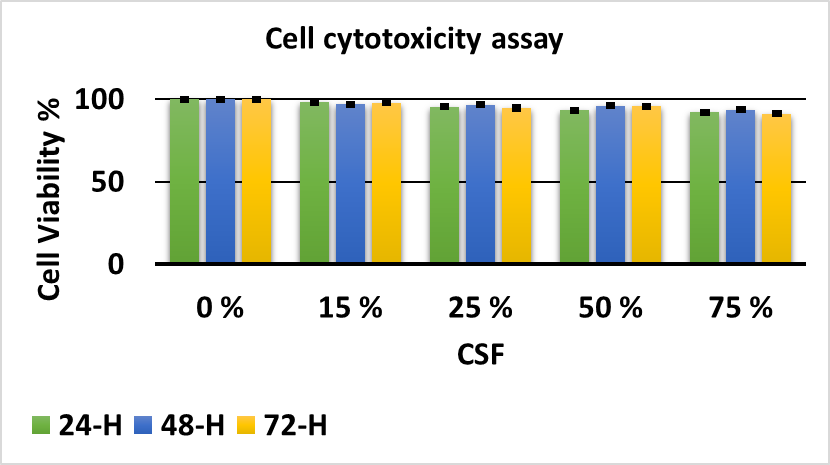 The toxicity of cerebrospinal fluid (CSF) on neural progenitor cells (NPCs) was assessed using the MTT assay. Five plates were prepared, each receiving a different CSF concentration, and viability was measured after 24, 48, and 72 h. The control plate received no CSF and showed 100 % viability. The experimental plates received CSF at final concentrations of 15 %, 25 %, 50 %, and 75 %. Viability remained close to 100 % in every group. Consistent with previous studies, 50 % CSF was selected for subsequent experiments (Figure 1). Nevertheless, the unexpectedly high viability—even at 75 % CSF for 72 h—indicates a possible technical error, which we acknowledge as a limitation.
