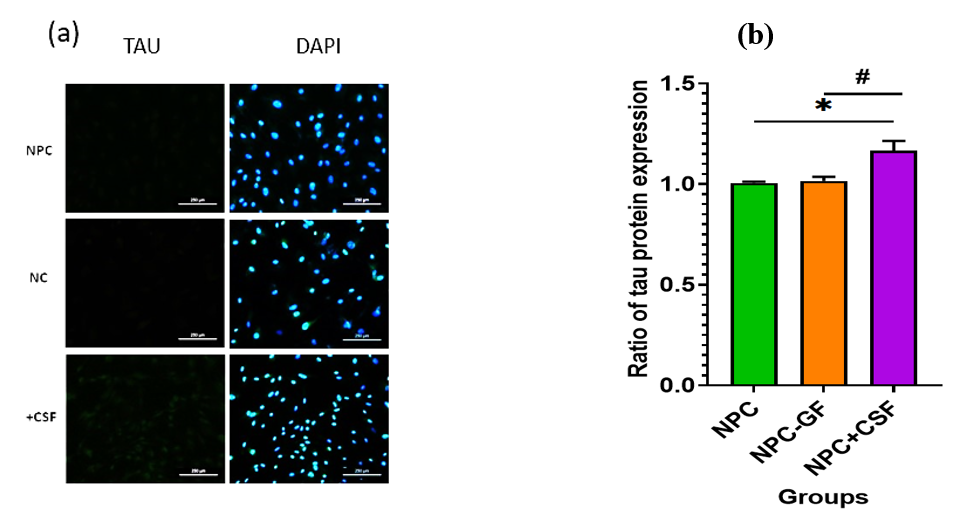 Immunocytochemistry was performed to evaluate TAU protein expression in two control groups and one experimental group. (a) Immunofluorescence staining after co-culture with TAU antibody. (b) Graphical representation of TAU expression in NPCs of the target group with the addition of (NPC-EGF/bFGF+CSF) compared to the control groups of NPCs without the addition of CSF with and without the addition of EGF and bFGF (NPC-EGF/bFGF, respectively).