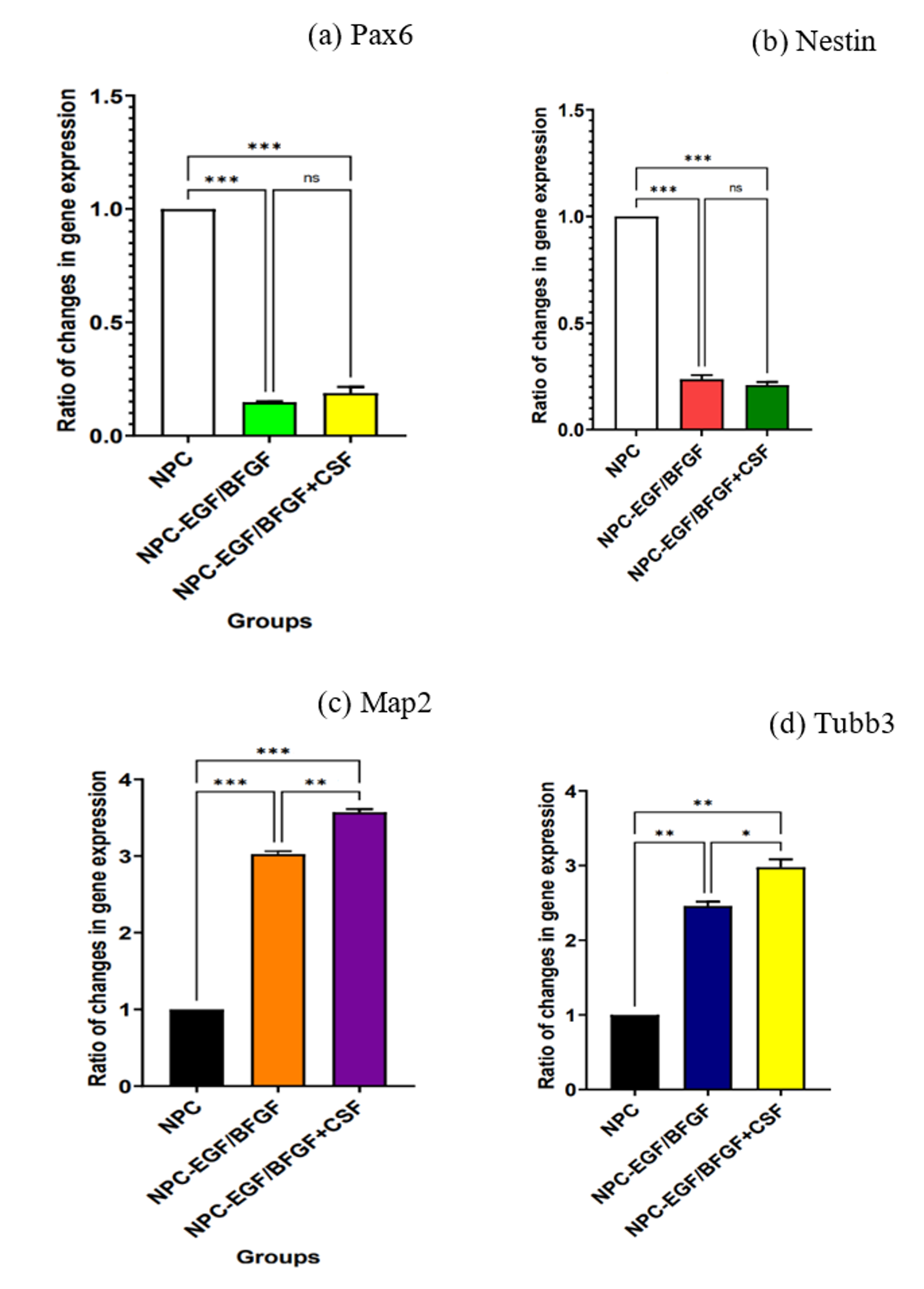 Relative gene-expression analysis. (a) Graph of Pax6 expression in neural progenitor cells of the target group with the addition of (NPC- EGF/bFGF+CSF) compared to the NPC control groups without the addition of CSF with and without the addition of EGF and bFGF (NPC-EGF/bFGF and NPC, respectively). (b) Diagram of Nes expression in neural progenitor cells of the target group with the addition of (NPC- EGF/bFGF+CSF) compared to the control NPC groups without the addition of CSF with and without the addition of EGF and BFGF (NPC-EGF/bFGF and NPC, respectively). (c) Diagram of Map2 expression in neural progenitor cells of the target group with the addition of (NPC- EGF/bFGF+CSF) and the NPC control groups without the addition of bFGF and EGF (NPC and NPC-EGE/bFGF, respectively). (d) Diagram of Tubb3 expression in NPCs of the target group with the addition of (NPC- EGF/bFGF+CSF). Compared to the NPC control groups without the addition of CSF with and without the addition of BFGF and EGF (NPC and NPC-EGF/bFGF respectively).