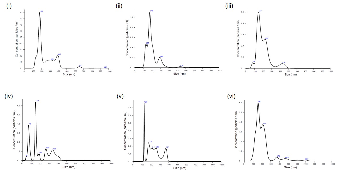 SVF-sEVs Concentration – (i) to (iii); Collagenase type II and (iv) to (vi) Collagenase type IV. (i) 37.1 particles/ frame; (ii) 46.6 particles/ frame; (iii) 30.2 particles/frame.