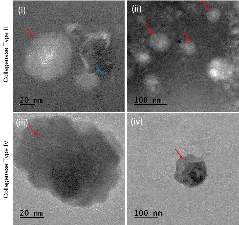Images of transmission electron microscopy (TEM) of SVF-sEVs. (i) & (ii)- Collagenase type II: Red arrows indicate intact sEVs. Blue arrow shows lipoprotein aggregates. (iii) & (iv)- Collagenase type IV: Red arrows indicate ruptured sEVs.