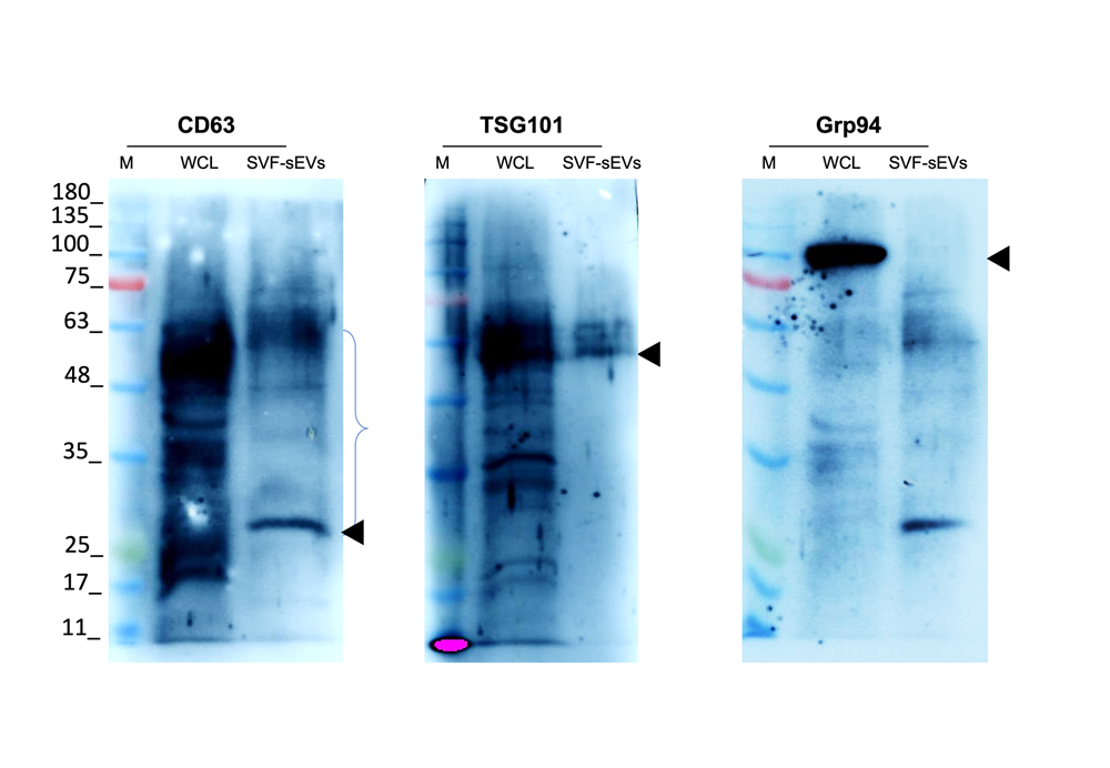 Detection of sEV-specific markers by Western blot. CD63 and TSG101-Positive markers. Grp94- Negative marker . Abbreviations: * M: Marker; WCL: Whole cell lysate; SVF-sEVs: Stromal vascular fraction-derived small extracellular vesicles.
