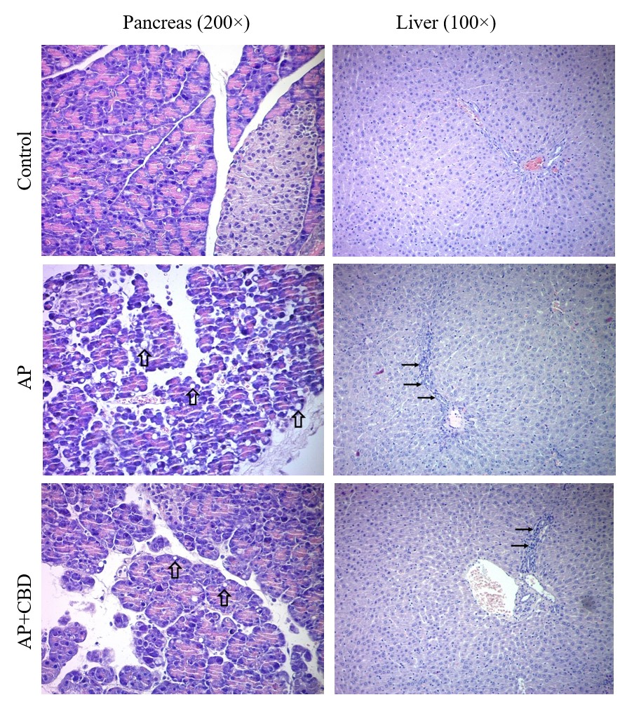Rat pancreatic and liver tissues, hematoxylin-eosin staining results. Control group, pancreatic tissue with well-structured acini and islet of Langerhans and normal liver tissue. AP group pancreatic tissue, hypertrophic acini containing medium and small-sized cytoplasmic vesicles (thick arrows). Liver tissue, regenerative changes in hepatocytes and moderate inflammation in the portal area (thin arrows). AP+CBD group pancreatic tissue, acinar cells with small cytoplasmic vesicles (thick arrows). Liver tissue, mild inflammation in the portal area (thin arrows) and sinusoidal dilation. Abbreviations: AP: acute pancreatitis, AP+CBD: acute pancreatitis+cannabidiol