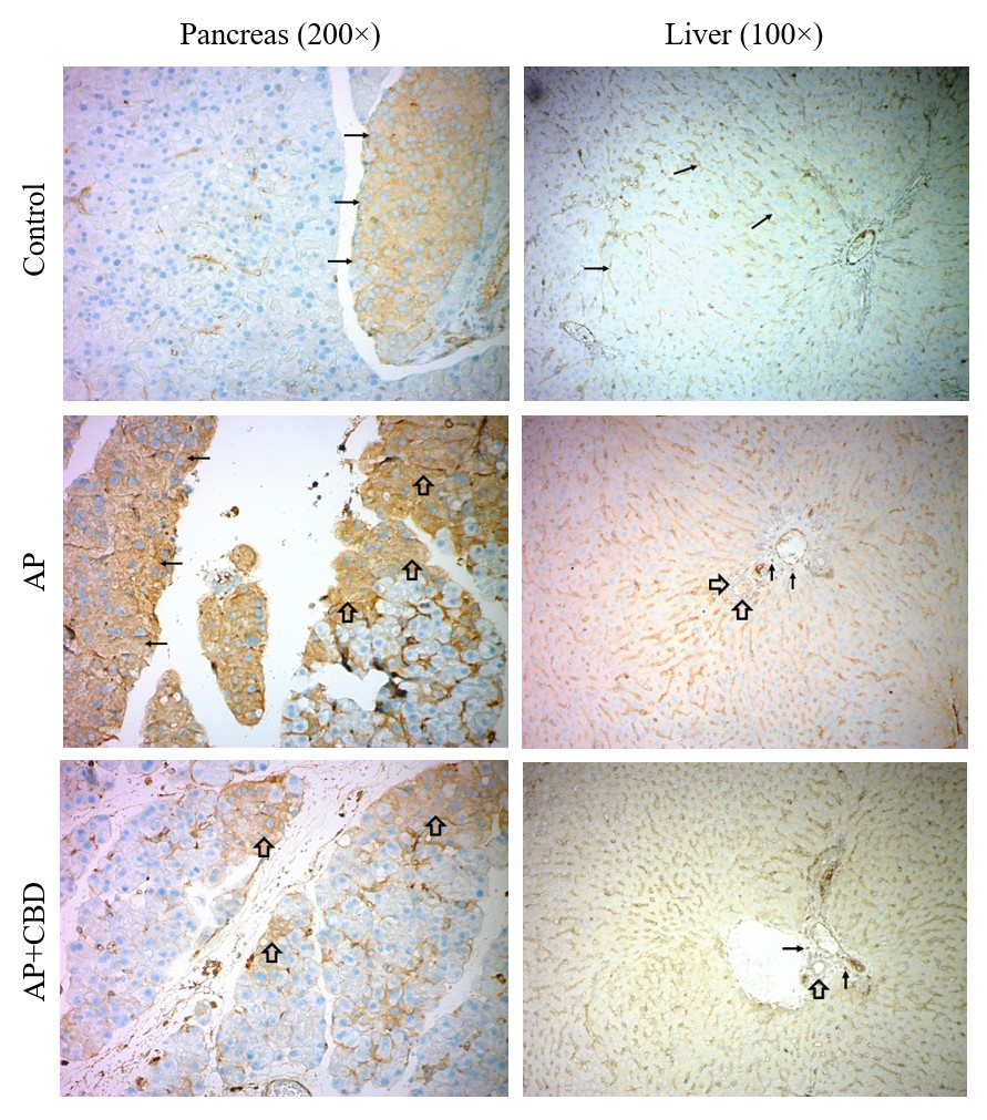 Results: Caerulein administration increased serum lipase levels and induced tissue damage by elevating oxidative stress and nuclear factor-κB (NF-κB) immunoreactivity in the pancreas and liver. CBD treatment reduced histopathologic damage and oxidative stress in both organs. NF-κB immunoreactivity in the pancreas was significantly reduced, while its activity in the liver appeared to be elevated.