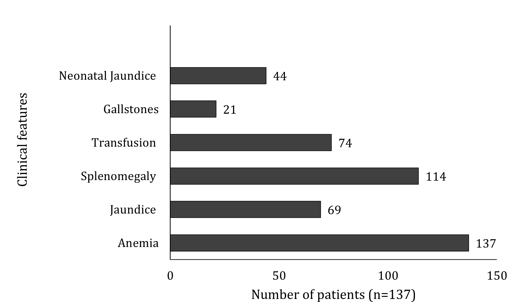 The bar chart in Figure 1 summarizes the clinical features of HS reported in five pediatric studies comprising 137 patients published between 1991 and 2021 42,43,44,45,46. Most pediatric cases present with anemia, followed by splenomegaly, transfusion requirement, jaundice, and neonatal jaundice. HS is more frequent in Northern Europeans than in Southeast Asians. The number of pediatric patients with gallstones was relatively low. Nevertheless, the current incidence and prevalence of HS in Malaysia remain unknown because of the limited number of publications 41,42,43,44,45,46.