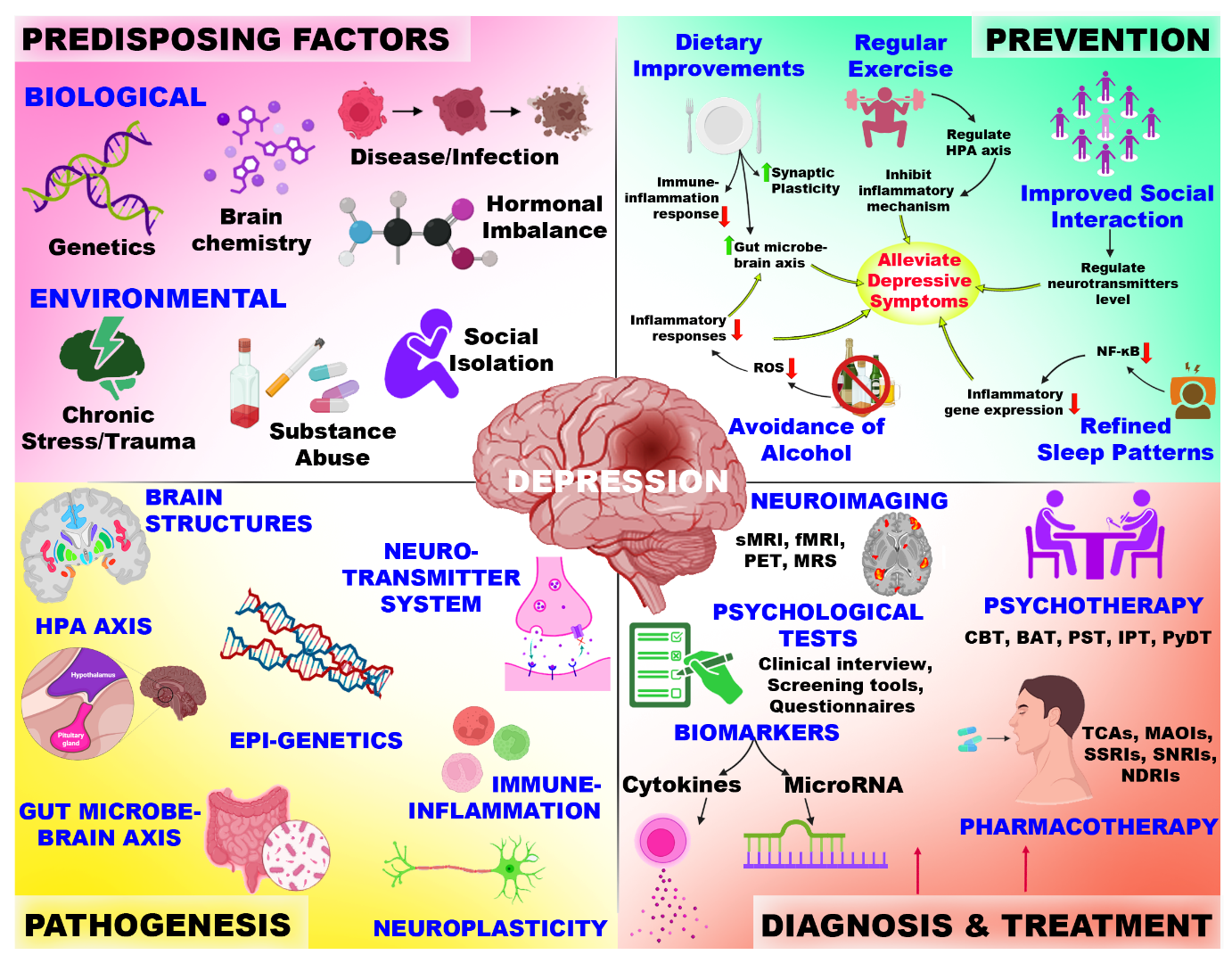 The figure depicts a conceptual overview of MDD, explaining predisposing factors, such as biological and environmental, that influence the central pathogenic domains. The figure also highlights the prevention strategies based on lifestyle diagnostic tools and established therapeutic approaches in clinical practice.