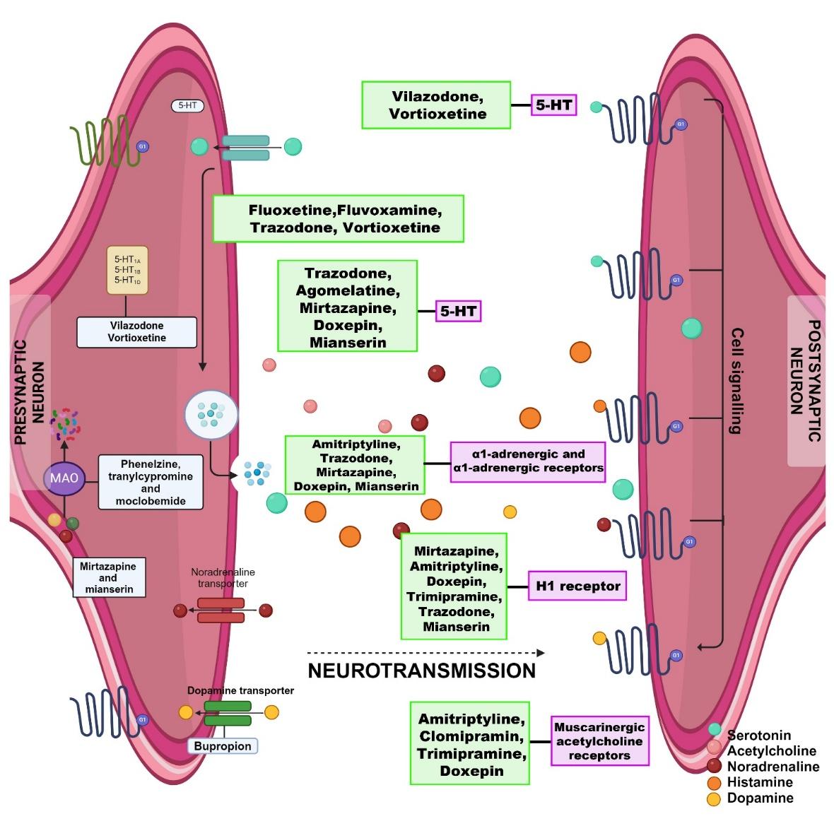 Mechanistic and key signaling pathways involved in the action of antidepressants at the synaptic core. The figure illustrates the influence of different categories of antidepressants on monoamine transmission by targeting various systems, including presynaptic transporters, metabolic enzymes, and postsynaptic receptors.