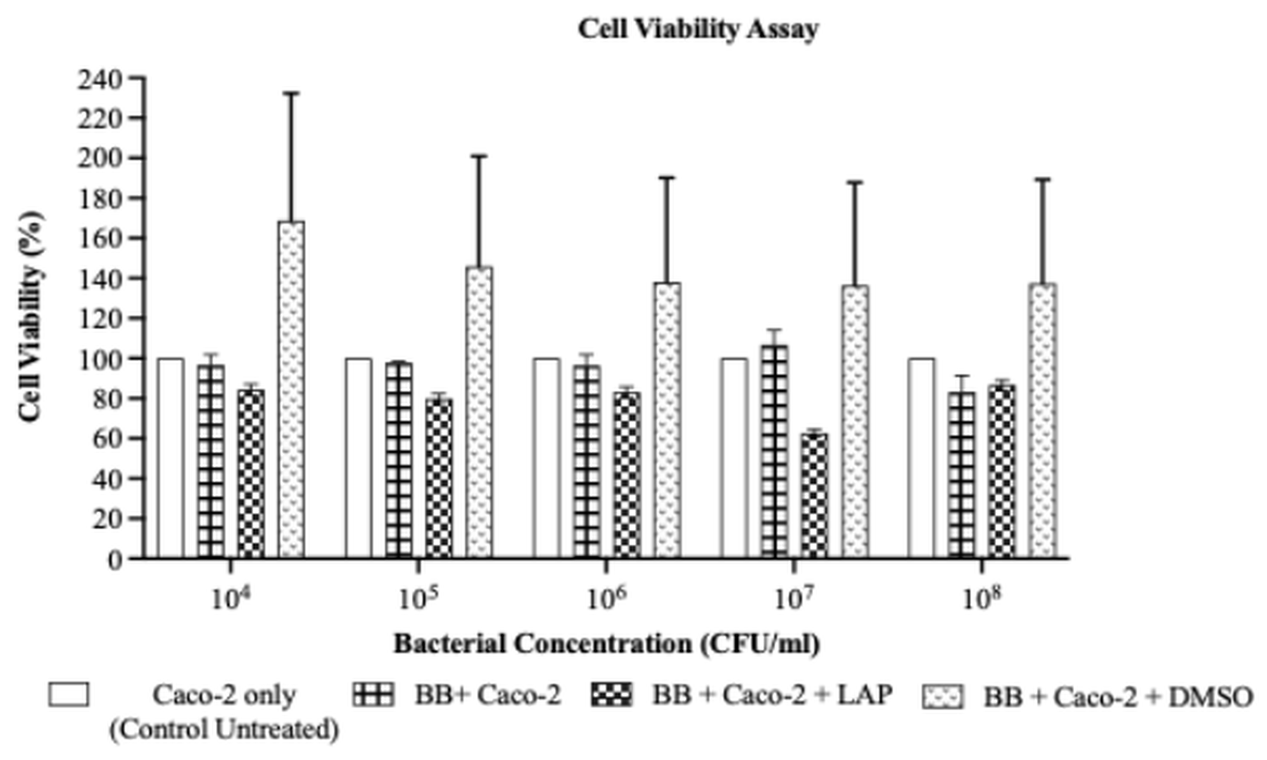 A graph of the percentage of Caco-2 cell viability versus the concentration of BB culture was plotted to identify the optimum concentration of BB culture that maintained both bacterial survival and a measurable Caco-2 cellular response. The optimum bacterial concentration determined from this experiment was then used for subsequent assays.