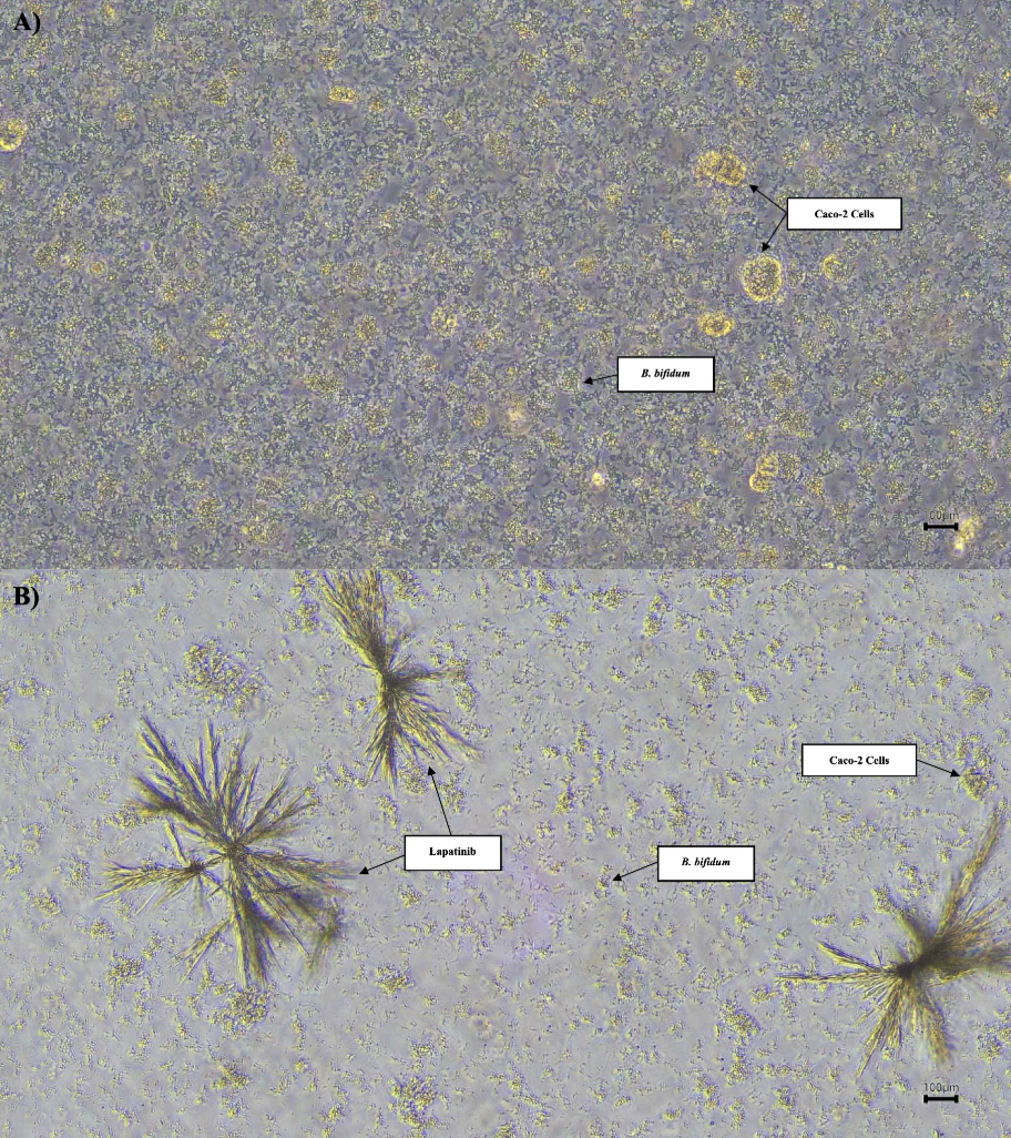 Results: LAP reduced Caco-2 cell viability at all bacterial concentrations, although differences were not statistically significant (p > 0.05). Although not statistically significant, a higher BB concentration (1 × 10^8 CFU/mL) was associated with slightly greater cell viability (86.60 % ± 2.73). While LAP initially decreased BB viability, bacterial proliferation subsequently increased, reaching 115.66 % ± 6.25 by 96 hours. A high number of viable, adhered BB was recovered from Caco-2 cells even after LAP treatment, indicating that bacterial-host interactions persisted despite drug exposure.