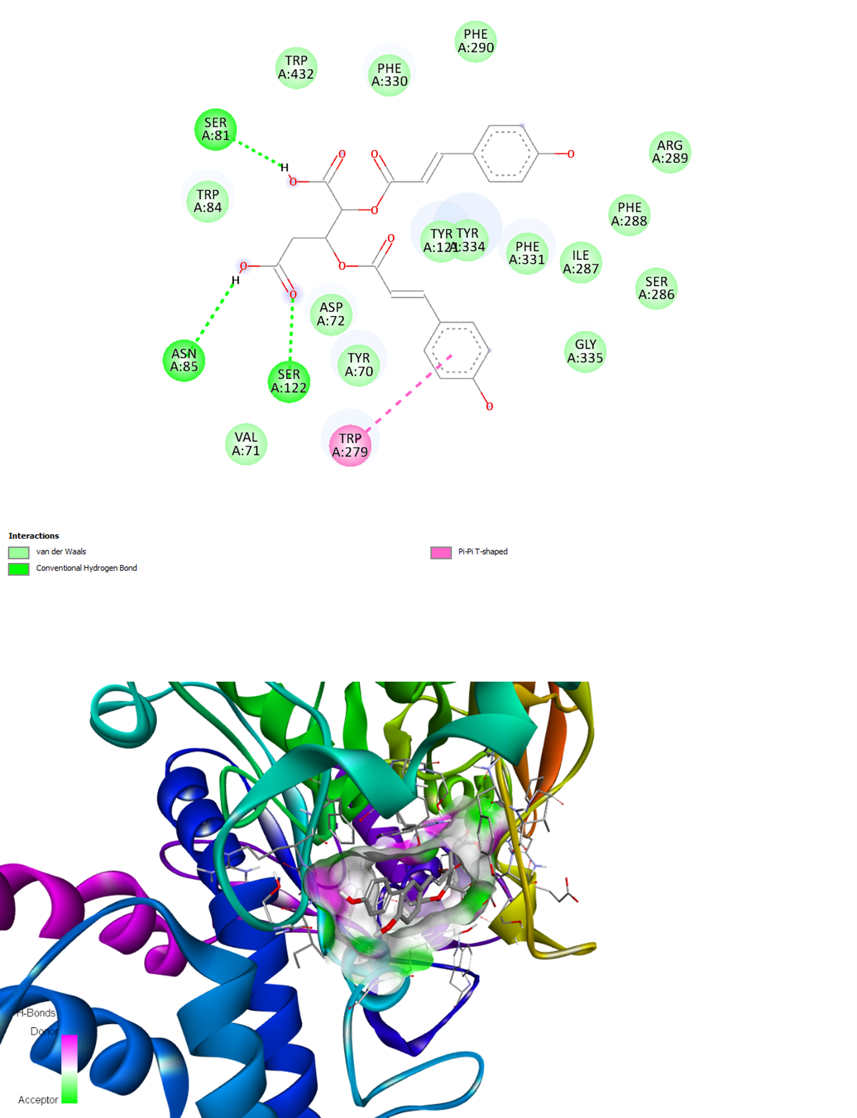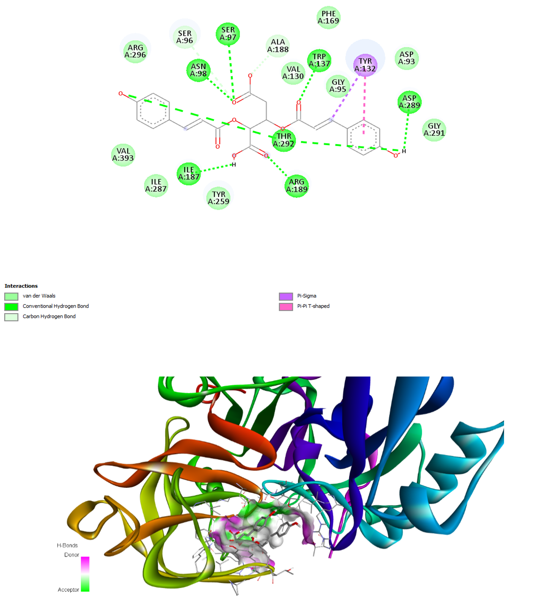 The binding interactions of FR258900 with the two target enzymes are visualized in Figures 1 and 2. In the BACE-1 complex, FR258900 participates in numerous stabilizing interactions, including van der Waals, conventional hydrogen bonds, and carbon–hydrogen bonds. The compound further establishes pi–pi T-shaped interactions with Tyr292 and pi–sigma interactions with Tyr132, thereby forming a complete active-site binding network. As shown in Figure 2, the binding interactions of the AChE complex demonstrate equally intense intermolecular contacts through conventional hydrogen bonds, extensive van der Waals contacts, and a pi-pi T-shaped interaction with Trp279. These interaction modes are consistent with those of known inhibitors, demonstrating that FR258900 can interact with the conserved active-site residues of both target enzymes.