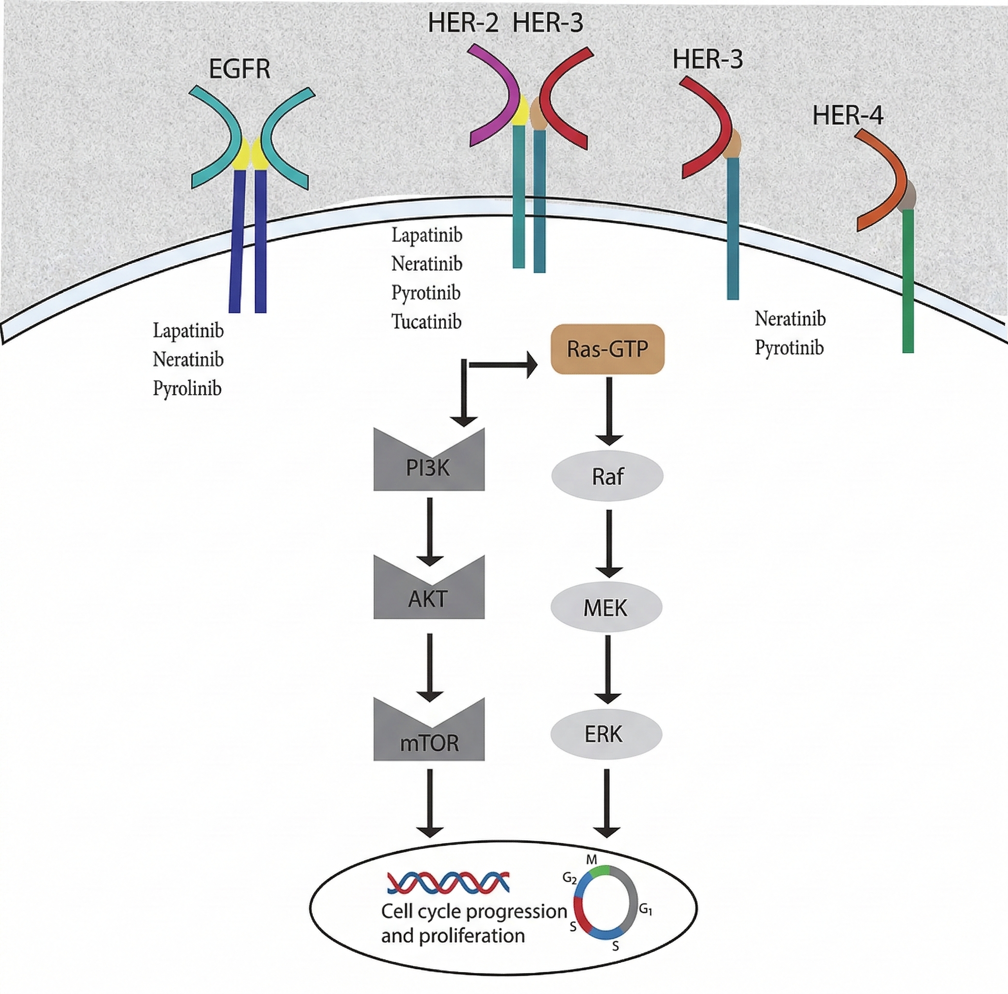 Schematic representation of the biochemical mechanisms and downstream signaling pathways targeted by HER2-selective Tyrosine Kinase Inhibitors (TKIs). This figure illustrates the inhibition of the Human Epidermal Growth Factor Receptor (HER) family, including EGFR (HER1), HER2, HER3, and HER4. Unlike other receptors, HER2 has no known active ligand and is activated through homo- or heterodimerization, which triggers the phosphorylation of cytoplasmic tyrosine residues. Small-molecule TKIs such as lapatinib, neratinib, pyrotinib, and tucatinib penetrate the cell membrane to bind the intracellular kinase domain, effectively blocking the Ras-GTP/Raf/MEK/ERK and PI3K/AKT/mTOR signaling cascades. The disruption of these pathways inhibits the oncogenic signals required for cell cycle progression and tumor cell proliferation.