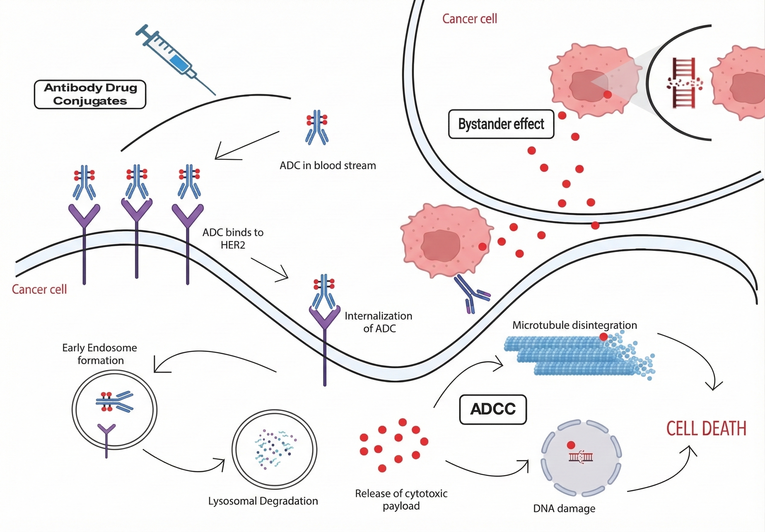 Schematic representation of the mechanism of action and resistance of Antibody-Drug Conjugates (ADCs) in HER2-positive breast cancer. This figure illustrates the targeted delivery of cytotoxic payloads to malignant cells. Upon the binding of the monoclonal antibody (e.g., trastuzumab) to the HER2 receptor, the ADC complex is internalized via receptor-mediated endocytosis, leading to early endosome formation and subsequent lysosomal degradation. The release of the cytotoxic payload (e.g., microtubule inhibitors or DNA-damaging agents) into the cytosol triggers apoptosis. ADCs utilizing cleavable linkers can also exert a bystander effect, where the released payload diffuses to eliminate adjacent HER2-negative cancer cells. Additionally, the figure highlights mechanisms of action such as Antibody-Dependent Cellular Cytotoxicity (ADCC) and Complement-Dependent Cytotoxicity (CDC). Known resistance pathways, including target antigen downregulation, impaired lysosomal trafficking, and ABC transporter-mediated drug efflux, are also contextually represented.