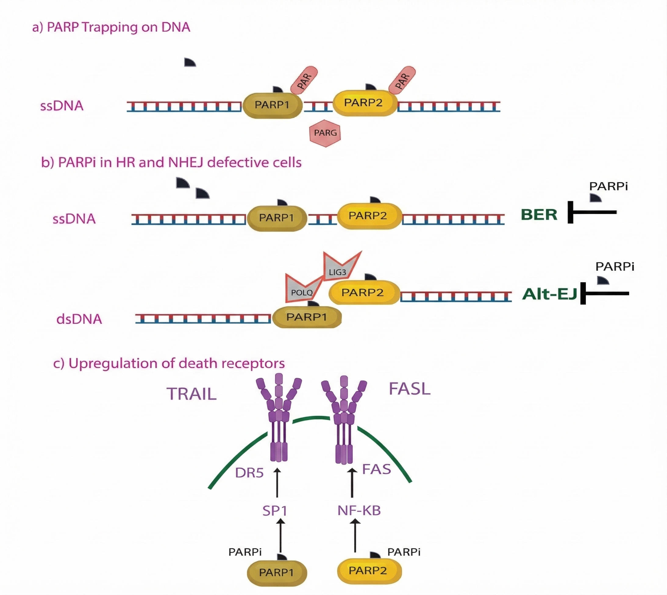 The nucleus contains a vast array of DNA damage sensors that recruit downstream effectors to sites of injury. One such protein, poly(ADP-ribose) polymerase-1 (PARP1), is ubiquitously expressed and activated by DNA strand breaks. Upon activation, it synthesizes poly(ADP-ribose) (PAR) chains, which serve as a scaffold or signal for the recruitment of numerous DNA repair proteins 34. PARP1 is one of 17 enzymes that transfer PAR or mono-ADP-ribose moieties onto themselves or other target proteins, making it a member of the ADP-ribosyltransferase superfamily. Additionally, PARP1, PARP2, and PARP3 are DNA-dependent ADP-ribosyltransferases. While PARP3 acts primarily as a mono-ADP-ribosyltransferase, PARP1 and PARP2 catalyze the formation of long PAR chains 35.