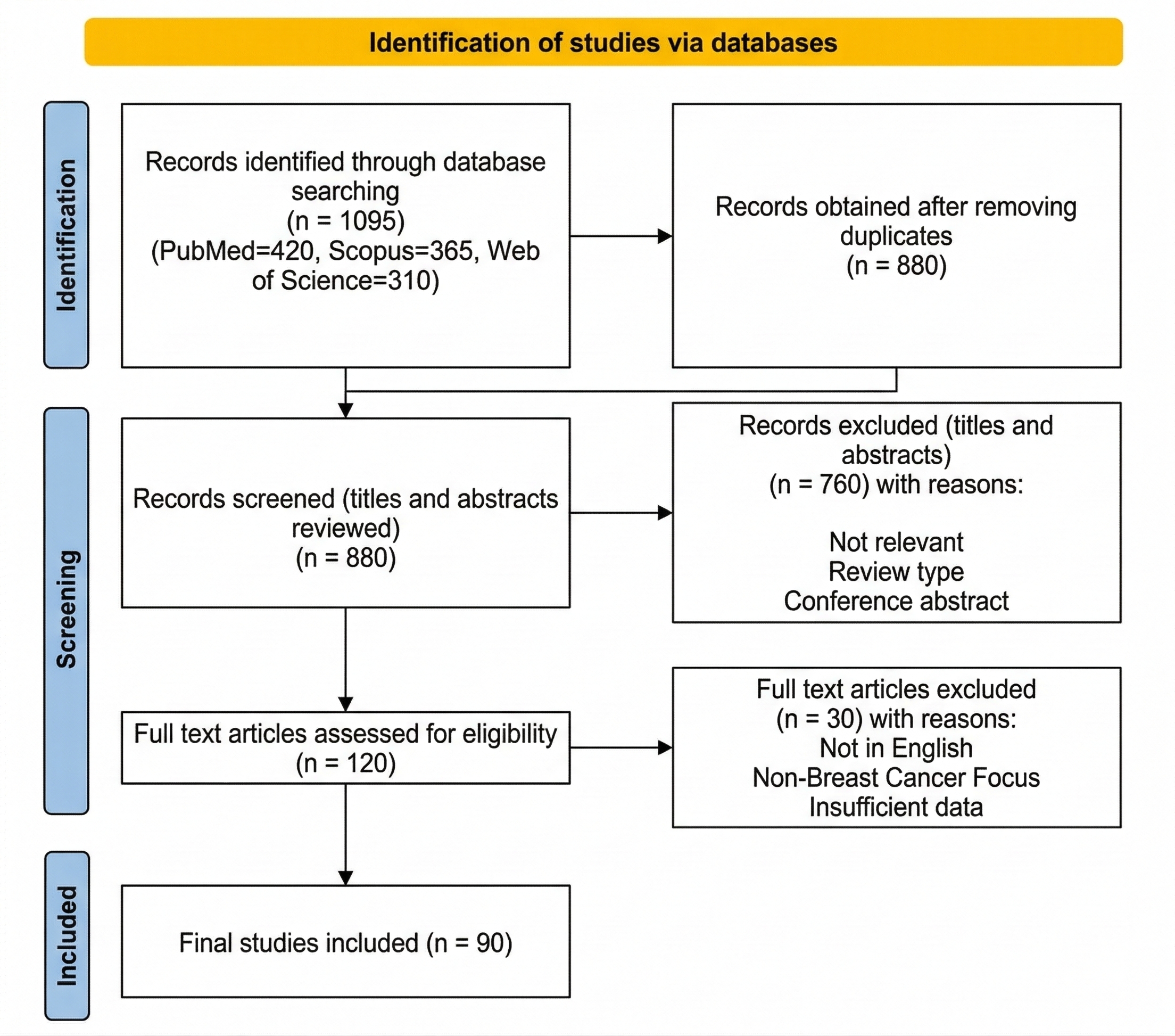 PRISMA 2020 Flow Diagram of Study Selection. This diagram illustrates the systematic literature search and screening process conducted across three major electronic databases: PubMed ($n = 420$), Scopus (n = 365), and Web of Science (n = 310). After the removal of 215 duplicates, 880 records were screened by title and abstract, resulting in the exclusion of 760 entries categorized as irrelevant, conference abstracts, or non-peer-reviewed types. A total of 120 full-text articles were assessed for eligibility, of which 30 were excluded due to being in languages other than English, lacking a breast cancer focus, or providing insufficient data. The final inclusion consists of 90 studies, including 22 clinical trials and over 50 mechanistic studies, evaluating genomic profiling, HER2-targeted therapies, and PARP inhibitors in breast cancer.