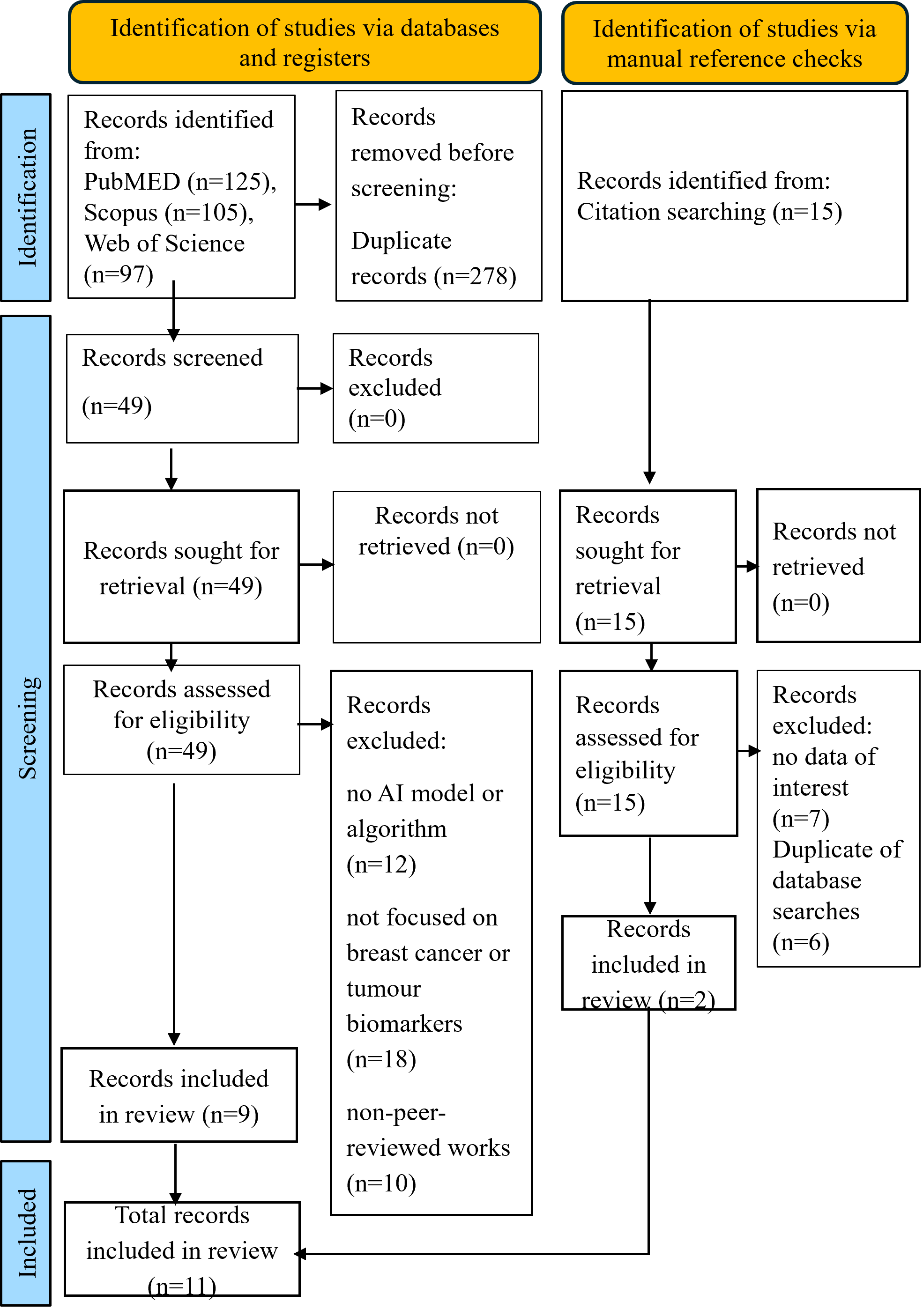 A total of 327 records were identified from PubMed, Scopus, and Web of Science, with 278 removed as duplicates before screening. Forty-nine were deemed eligible based on the abstract. Of these, 40 were excluded for specific reasons: 12 did not involve any AI model or algorithm, 18 were not focused on breast cancer or tumour biomarkers, and 10 were non-peer-reviewed works such as conference abstracts. Manual reference checks identified an additional 15 records, of which 13 were irrelevant or duplicates. Finally, 9 studies retrieved through database searches and 2 from manual reference checks made a total of 11 studies included in this review. The PRISMA-ScR flow diagram (Figure 1) and Supplementary 2 provide specific reasons for exclusion.