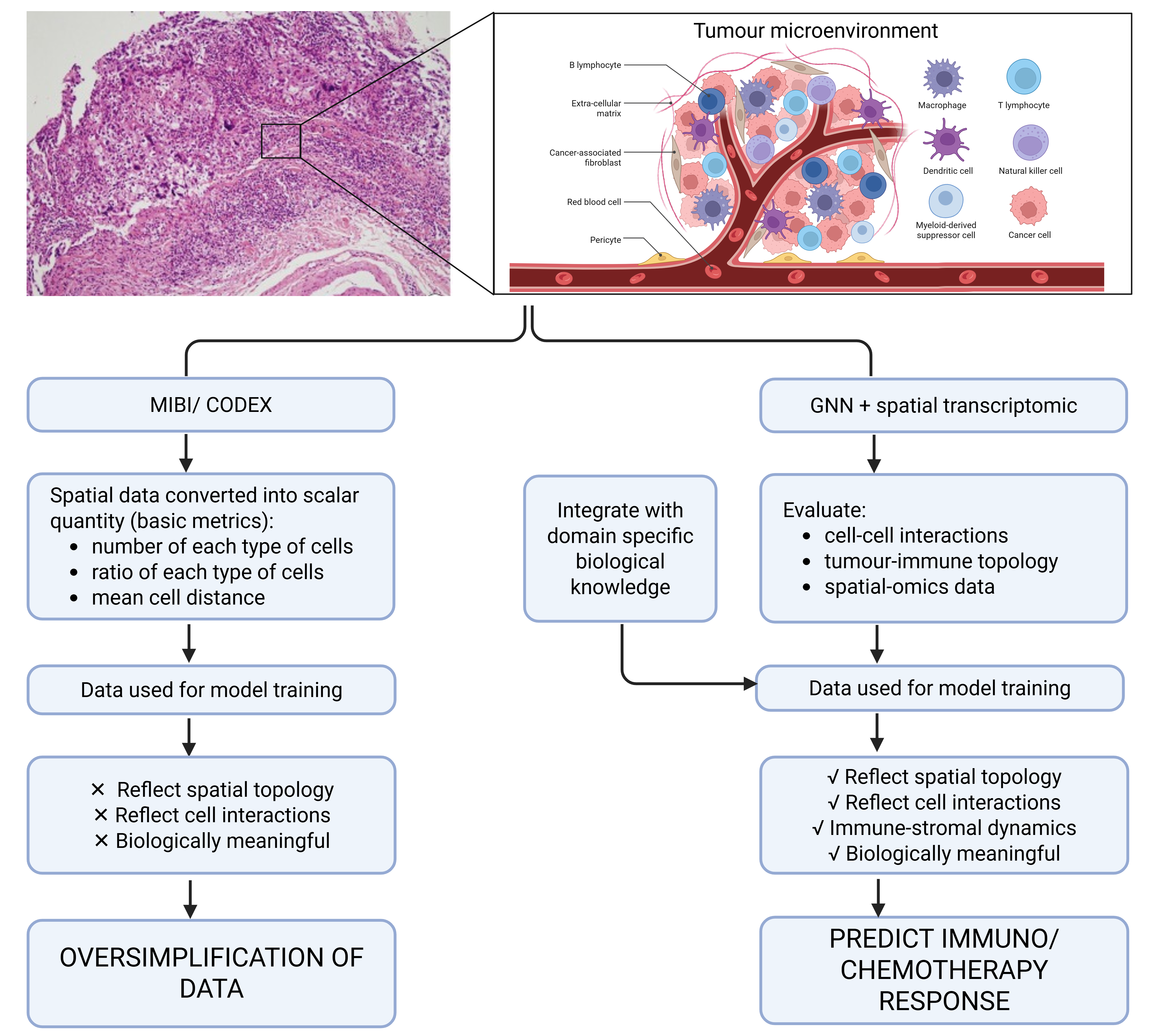 Conceptual framework proposed in this review: an AI-based model integrating GNNs with spatially resolved transcriptomics to capture tumour-immune spatial interactions. This schematic was created de novo in BioRender and does not reproduce or adapt any previously published figure. It builds upon the limitations highlighted by Malherbe (2021) but represents a novel conceptual model developed for this review.